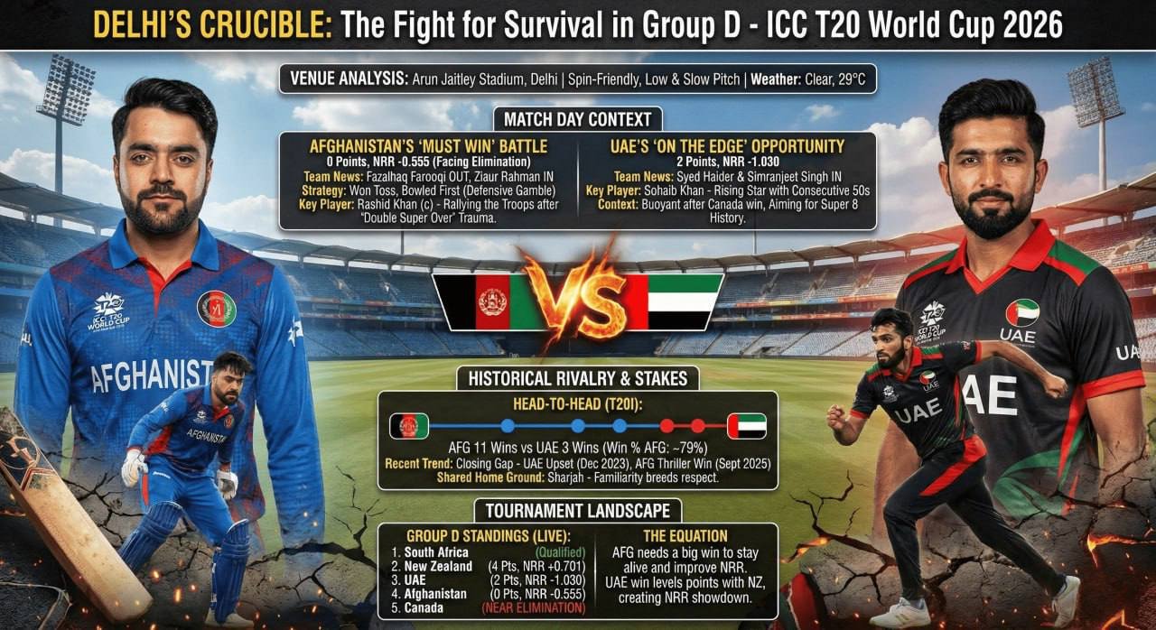AFG vs UAE T20 On the morning of February 16, 2026, the Arun Jaitley Stadium in New Delhi became the epicenter of a frantic struggle for survival in Group D of the ICC Men’s T20 World Cup. The contest between Afghanistan and the United Arab Emirates (UAE) was not merely a scheduled fixture in the global cricketing calendar; it was a collision of two diverging narratives within the Asian cricketing ecosystem. For Afghanistan, a Full Member nation with a semi-final pedigree from the 2024 edition, the tournament had curdled into a sequence of heartbreaks and near-misses. Sitting winless after two matches, including a historic and psychologically devastating “Double Super Over” loss to South Africa, Rashid Khan’s men entered the arena with their World Cup dreams hanging by a thread. Conversely, the UAE arrived with the buoyant energy of a rising Associate power, fresh from a gritty victory over Canada that validated their developmental structures and placed them in genuine contention for a Super 8 berth.